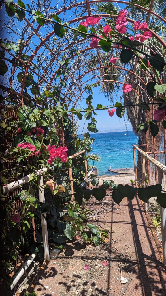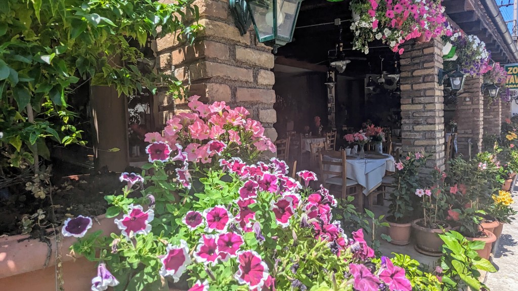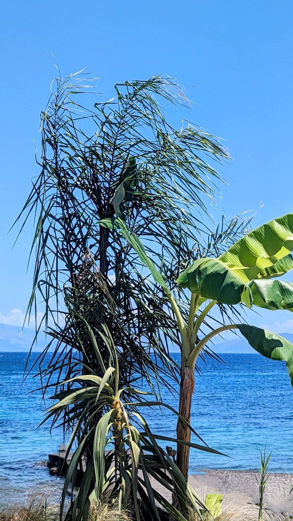 This time, we caught a bus to Benitses which had green mountains on one side of the road and the beautiful blue Ionian sea on the other. The public bus system around Corfu is very nice, and Google maps is excellent with charting the bus stop locations and times. So visiting different beaches is easy. Even the bougainvillea seems brighter in the Greek sunshine!