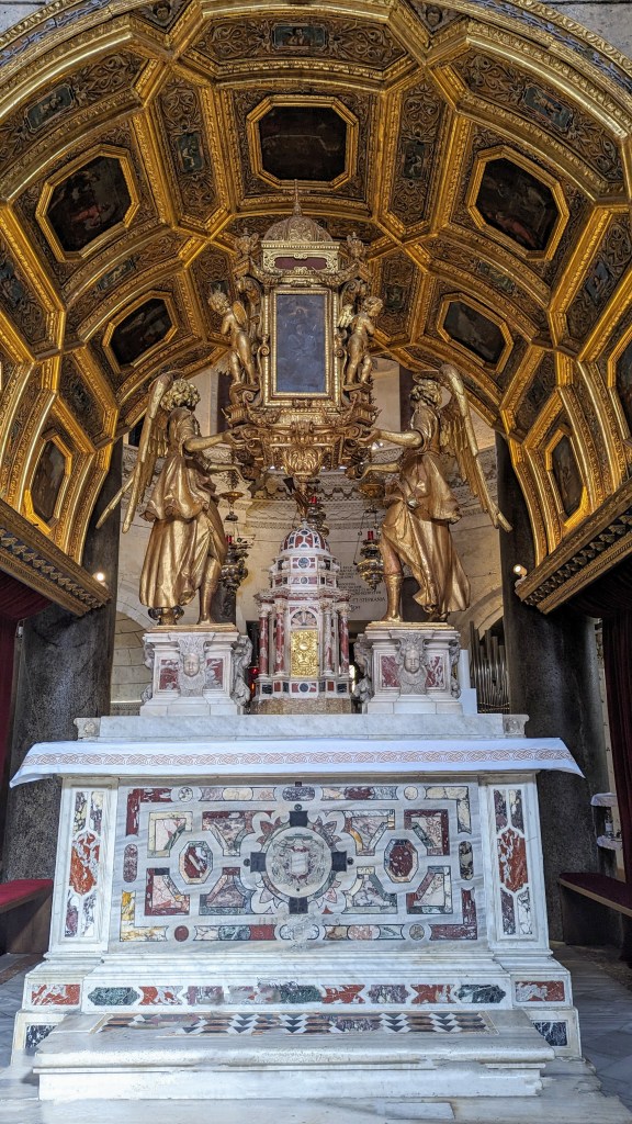 The head at the bottom of the picture contains part of a saint’s skull. To me, this is gross. I’m not sure I understand why people want to see pieces of Godly people (or anyone for that matter). It puts a different slant on Rest in Piece(s)!