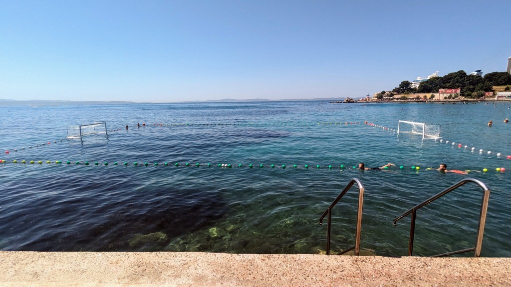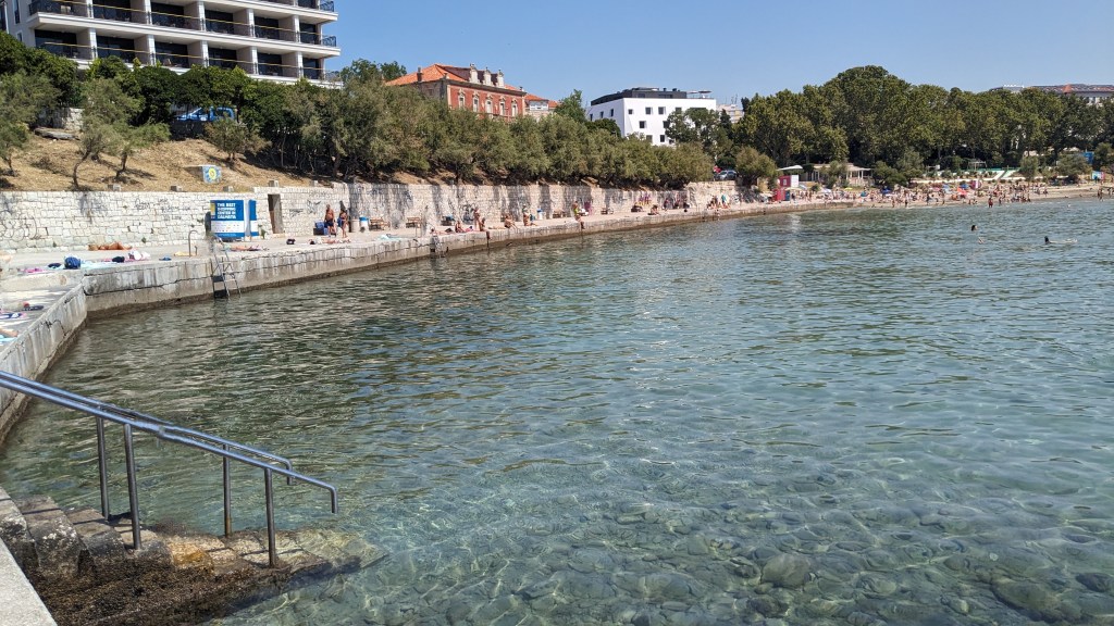 The next day was supposed to be an early day of roaming the old town one last time and a visit to the beach, but illness struck Rhia in the night. Dan’s being polite. I had the Croatian version of Delhi-Belly or Montezuma’s Revenge. I walked to the beach, which was unlike any beach I had been to before. The shore line had been designed and built like a HUGE swimming pool, complete with ladders, steps, water polo, diving, swim lanes, a sandy beach, lots of people, and no waves.