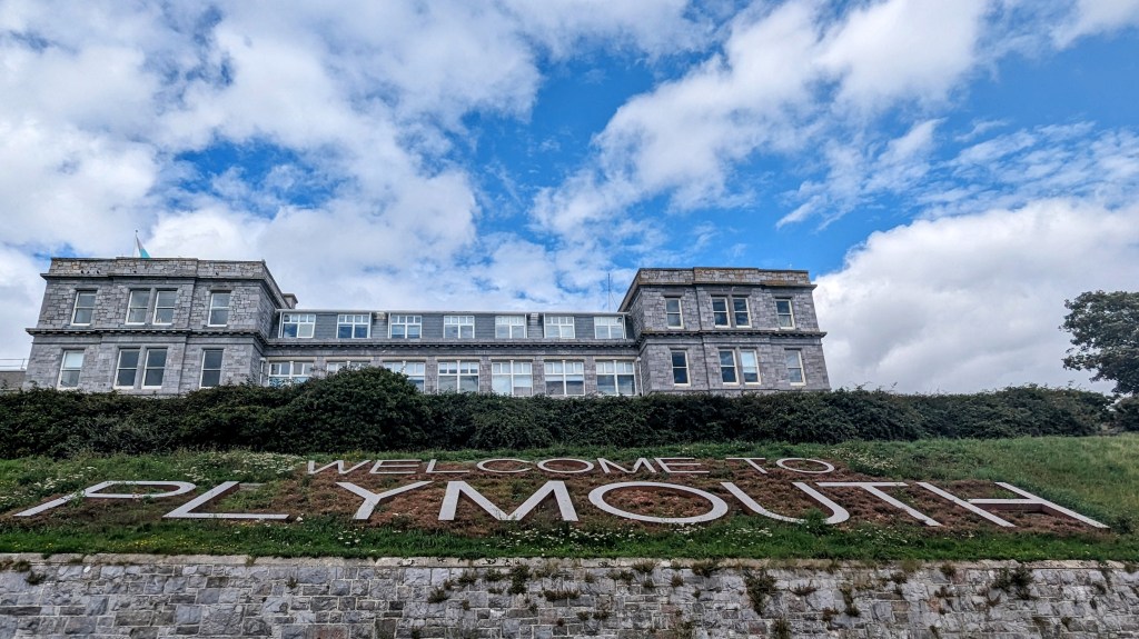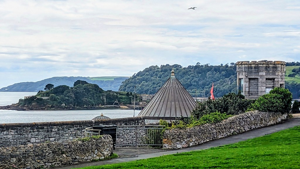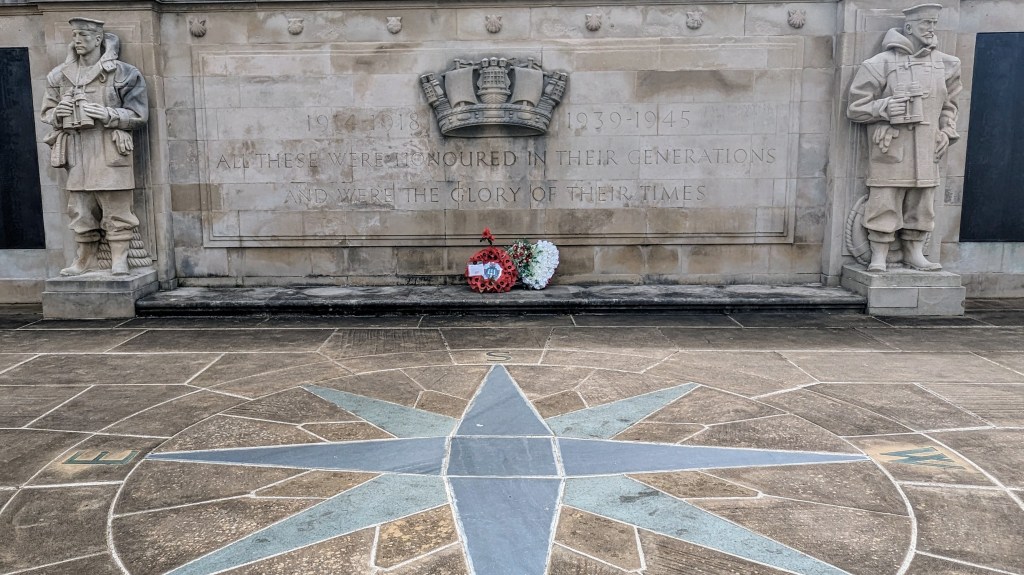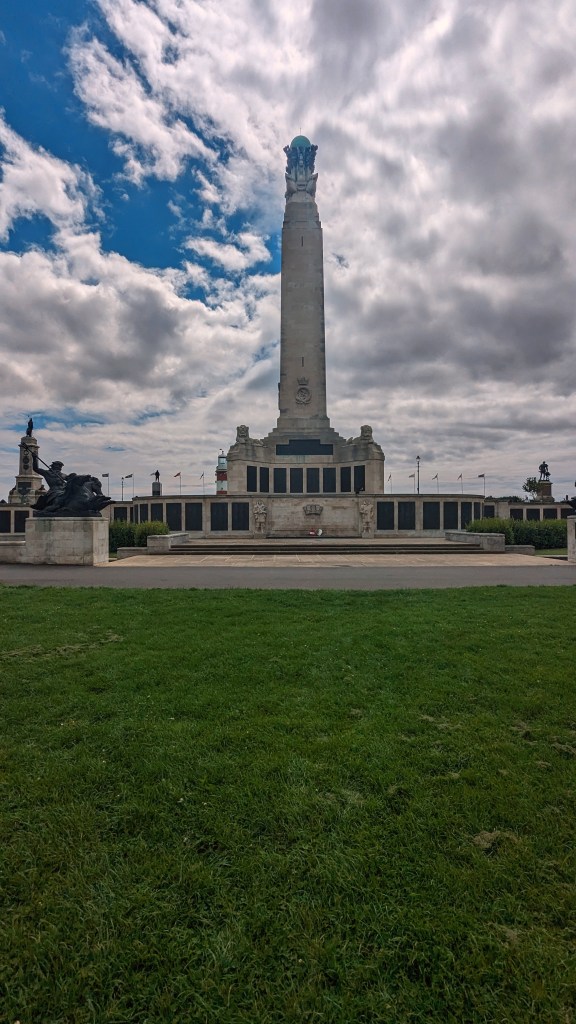 The next stop was the park overlooking the bay. It was here that Sir Francis Drake played bowls whilst waiting for the Spanish Armada to appear. We got this information from placards telling people about the history of Plymouth. The bowls playing seems to be an odd historical note in a city with so much other history. Now, a beautiful war memorial (commemorating those who lost their lives during the two World Wars overlooks the ocean…