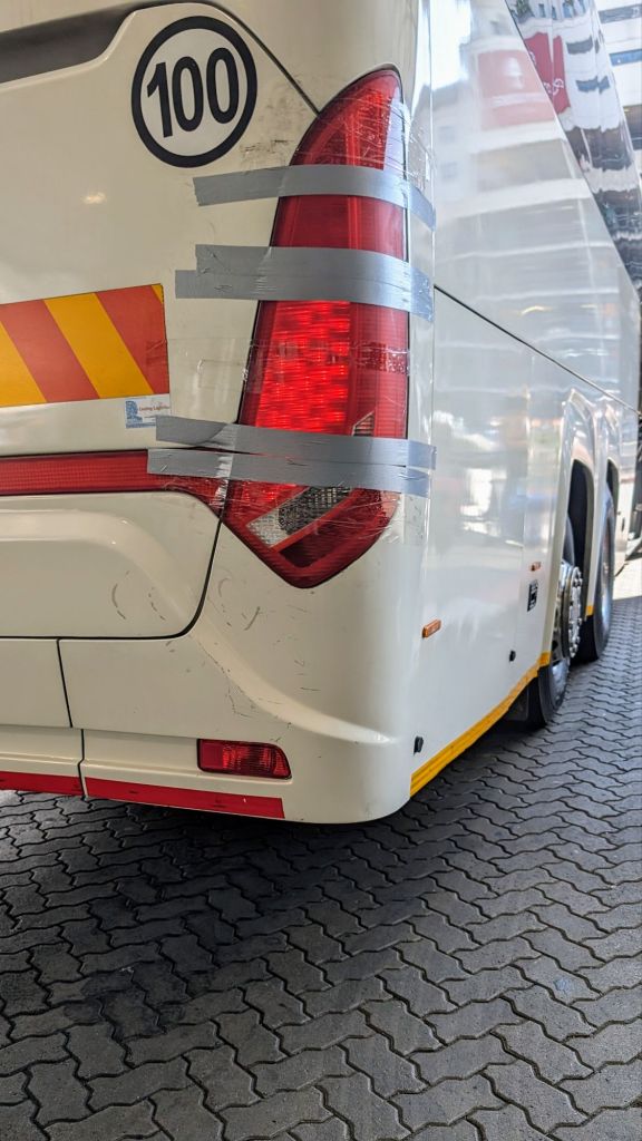Almost immediately after landing in Johannesburg, I was reminded of one of the things that makes Africa so…well, Africa. We had tickets for the bus to Gaborone and were told that, usually, it left around noon…unless it arrives early (any time after 11) in which case it would leave then. As it happened, today it left at 12:40 because they had to fix a broken brake light. For some reason, the fix made me think about two friends (Lisa and Suzette, both connosoirs