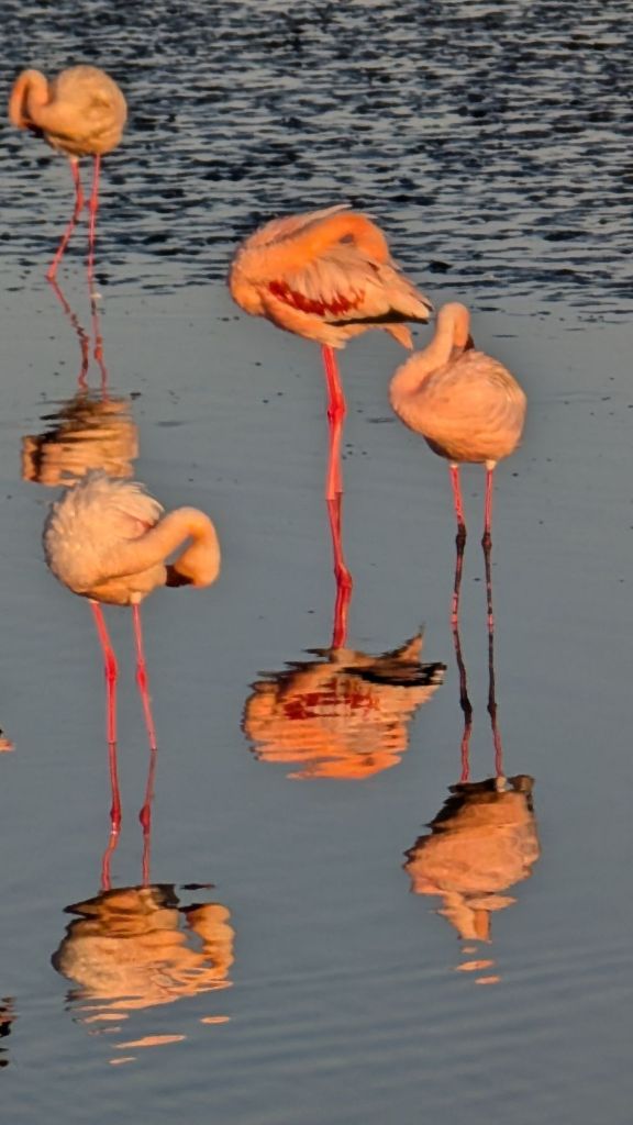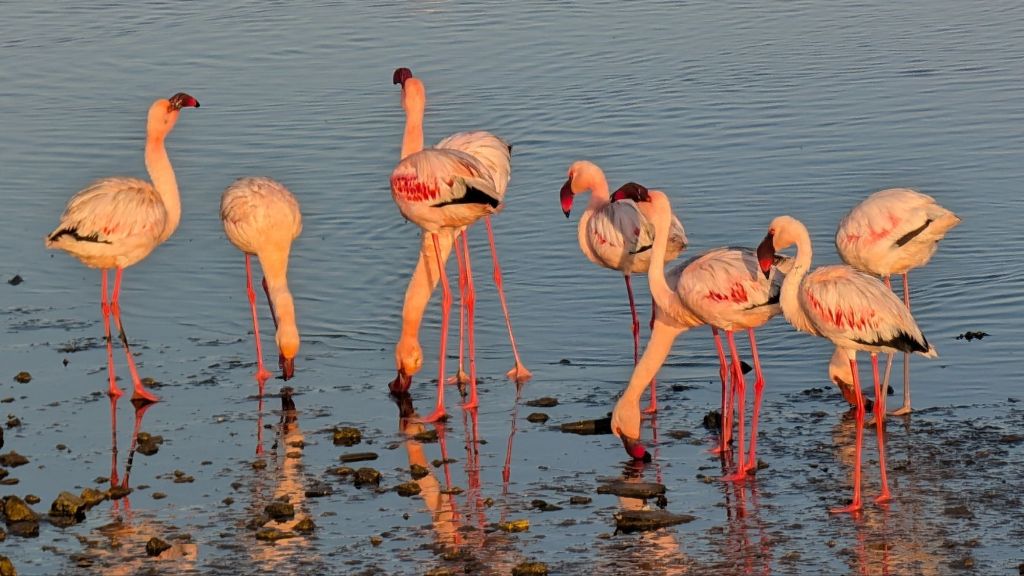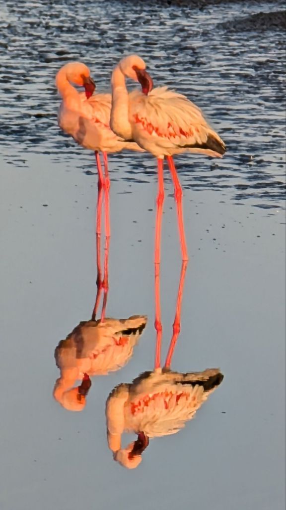I thought that flamingos got their pink color by eating shrimp, but we were told that these became pinker as they ate more of the pink algae that colored the water around here.