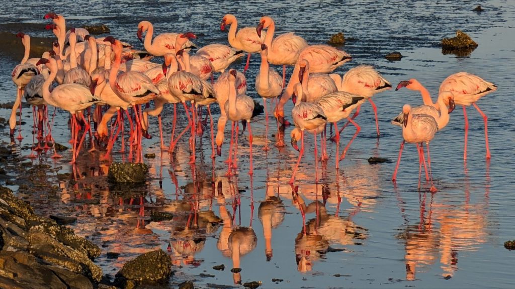 Sandwich Bay lies south of Walvis Bay, and can only be reached by a 4×4, so we booked a tour to get us down there. The drive took us past The Lagoon, and we stopped there so the driver could deflate the tires ready for the off-road journey. The flamingos seemed to have multiplied overnight and must have spent all night eating pink things as their color looked spectacular!