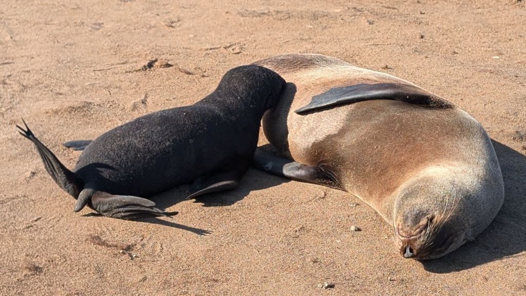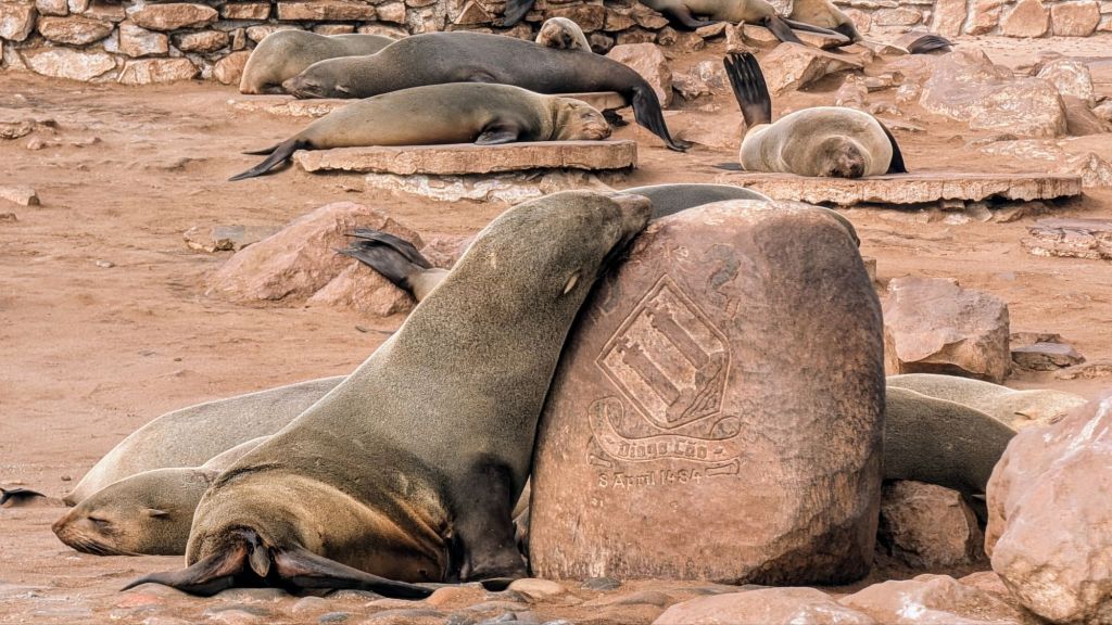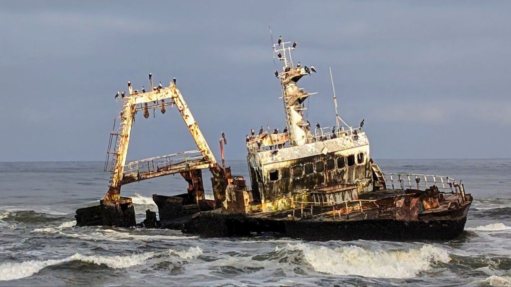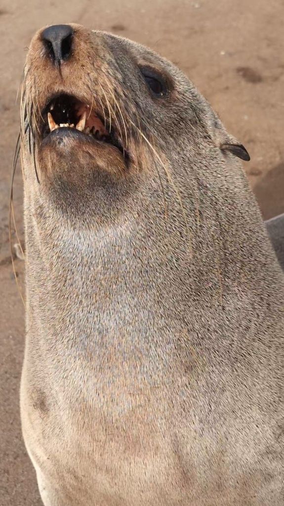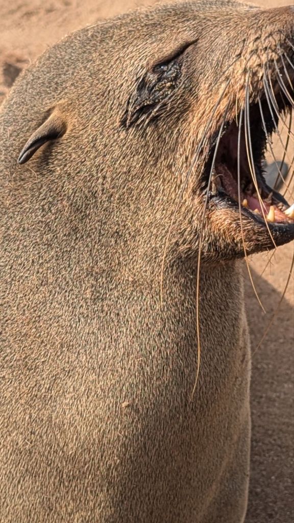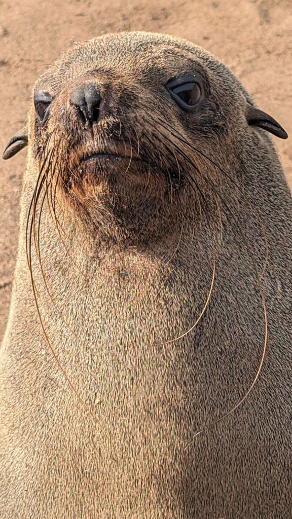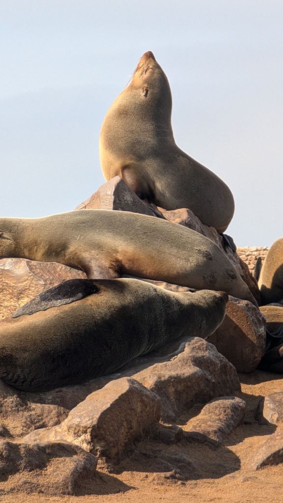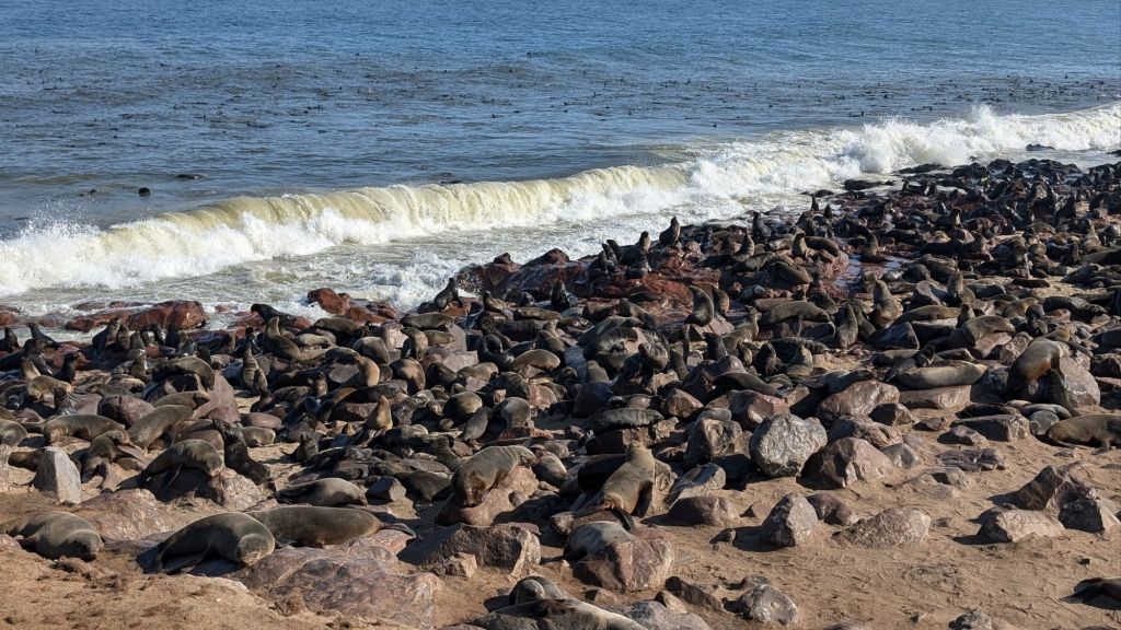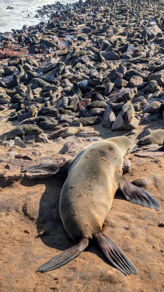Our next excursion was to Cape Cross to see the world’s second-largest seal nursery. On the way, we stopped to see an old shipwreck whose only crew now was the birds. Cape Cross is part of the Skeleton Coast, named for the amount of whale and animal bones that can be found along the hundreds of miles of coast line. This section of the ocean was huge for the whaling trade in the middle 19th century well into the 20th century. It is now also the home to numerous shipwrecks, but it was the bones that gave this coast its nickname.