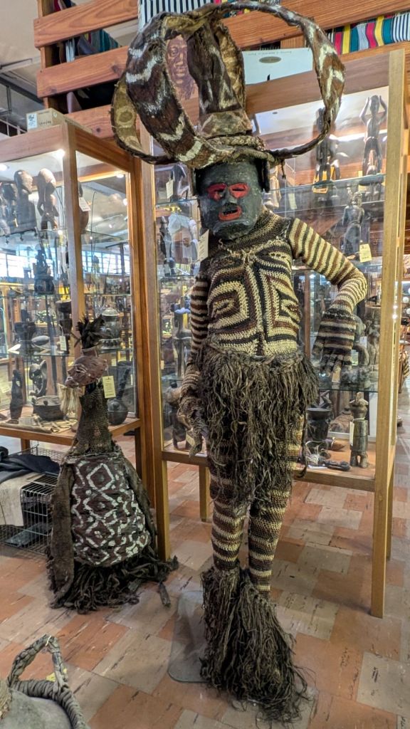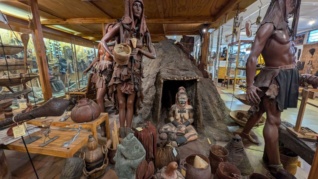 We stayed at the same guest house as our last visit, so walked the same streets into town. I think that the locals are very proud that they can walk safely around the city. On two separate occasions, older people (😂 they were MY age!!!!!) commented to us, with smiles, that walking around was great exercise, and safe! And our journey out led to a cool discovery. In the last post, we posted a picture of two statues of Two bushmen outside of a shop called The Bushman Art Gallery. We decided to walk in this time and found ourselves in a sort-of museum (that sold the artifacts!)