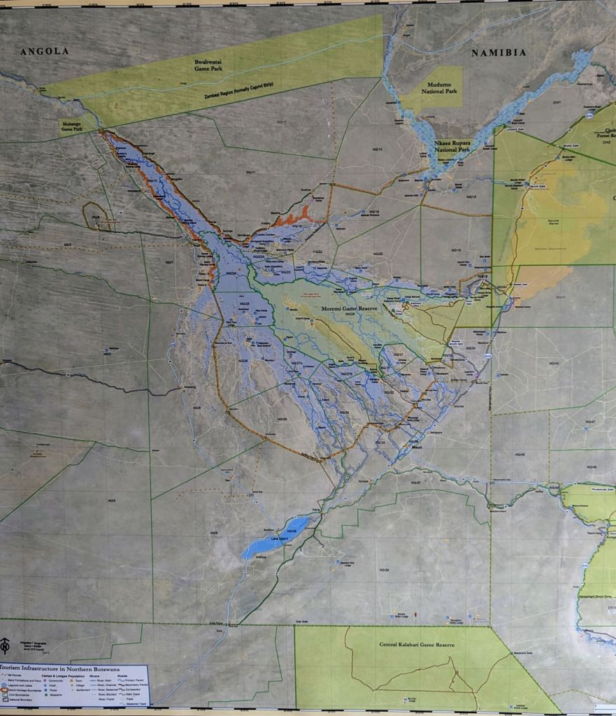 A map of the Okavango Delta. Unfortunately, most of that blue is only dust right now 😥. Maun is in the middle edge of all the blue fingers.