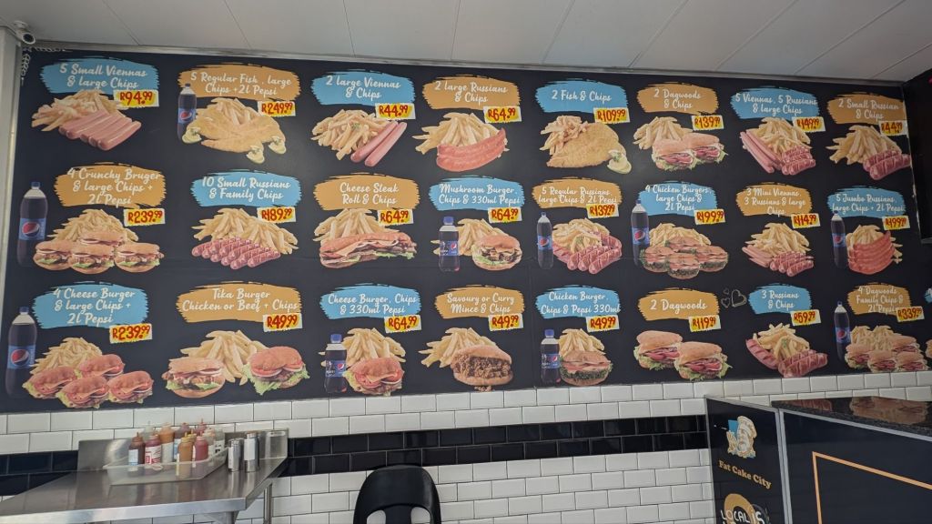 I thought you may be interested in seeing the prices of food; there are 18 rand to the $1 so a burger and chips costs less than $3!