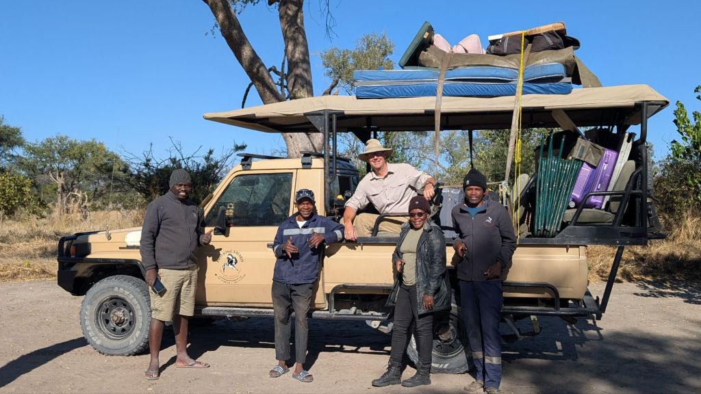 In addition to all the stuff, Frank (left) drives, Dan and I sit in the front seats, and Arnold (cook), Precious (trainee guide), and Lucas (camp hand) sit in the middle seats.