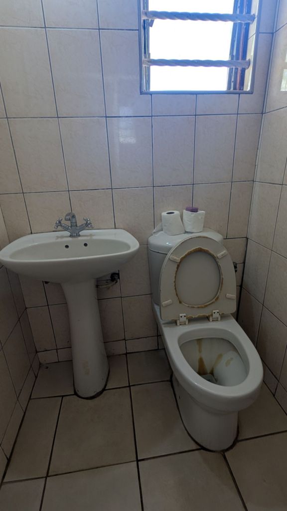 We got our choice of rooms, which is to say, either one with a toilet seat, or one without. Spoiled as we are, we chose with a toilet seat. Later, we discovered that the toilet tank could not fill with water (and I could not fix it) 😭. We had to fill a bucket and just dump the water in manually. BUT we had both running water and electricity…just not at the same time.