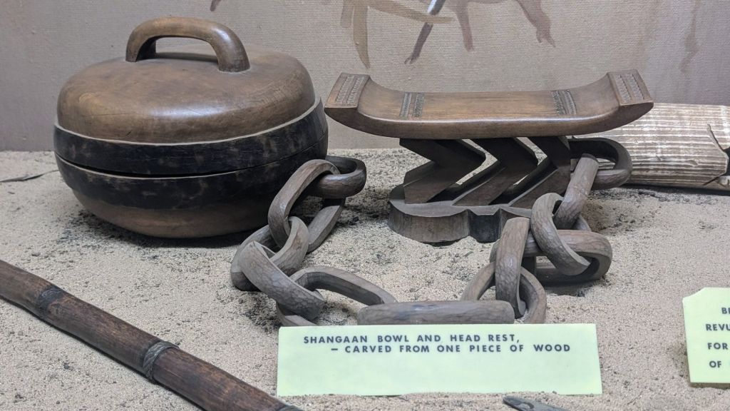 I learned that agriculture is the backbone of this area. The traditional crops are millet, sorghum, round nuts, ground nuts, cow peas, pumpkins, watermelons, wild potato, coco yams, and cassava. When the Europeans tried to introduce maize and rice, they did not fare so well (probably why I got served french fries instead of sadza (maize meal)🤪). Because of the mountainous area, they practice terrace farming. They also farm honey. Along the roadside from Birchenough Bridge to Mutare, there was a little stretch that had wood plinths displaying a single row small plastic jars that contained honey. (Sadly I don’t have a picture of them). That’s because Dan won’t slow down for me to get those photos!! 😤 The museum had a display of a living bee hive.