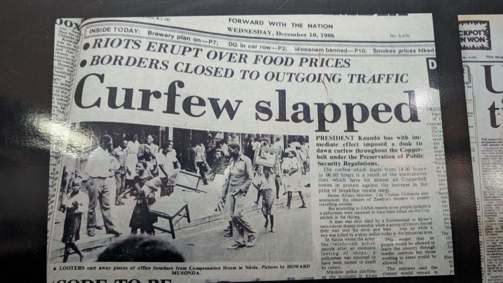 Something that blew me away was a newspaper article from December 10, 1986. I was in the Copperbelt at the time (in Kitwe) but had no idea about the demonstrations and curfew. The mines were around a place called Ndola so I can only guess that they didn’t extend to Kitwe??
