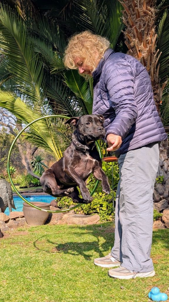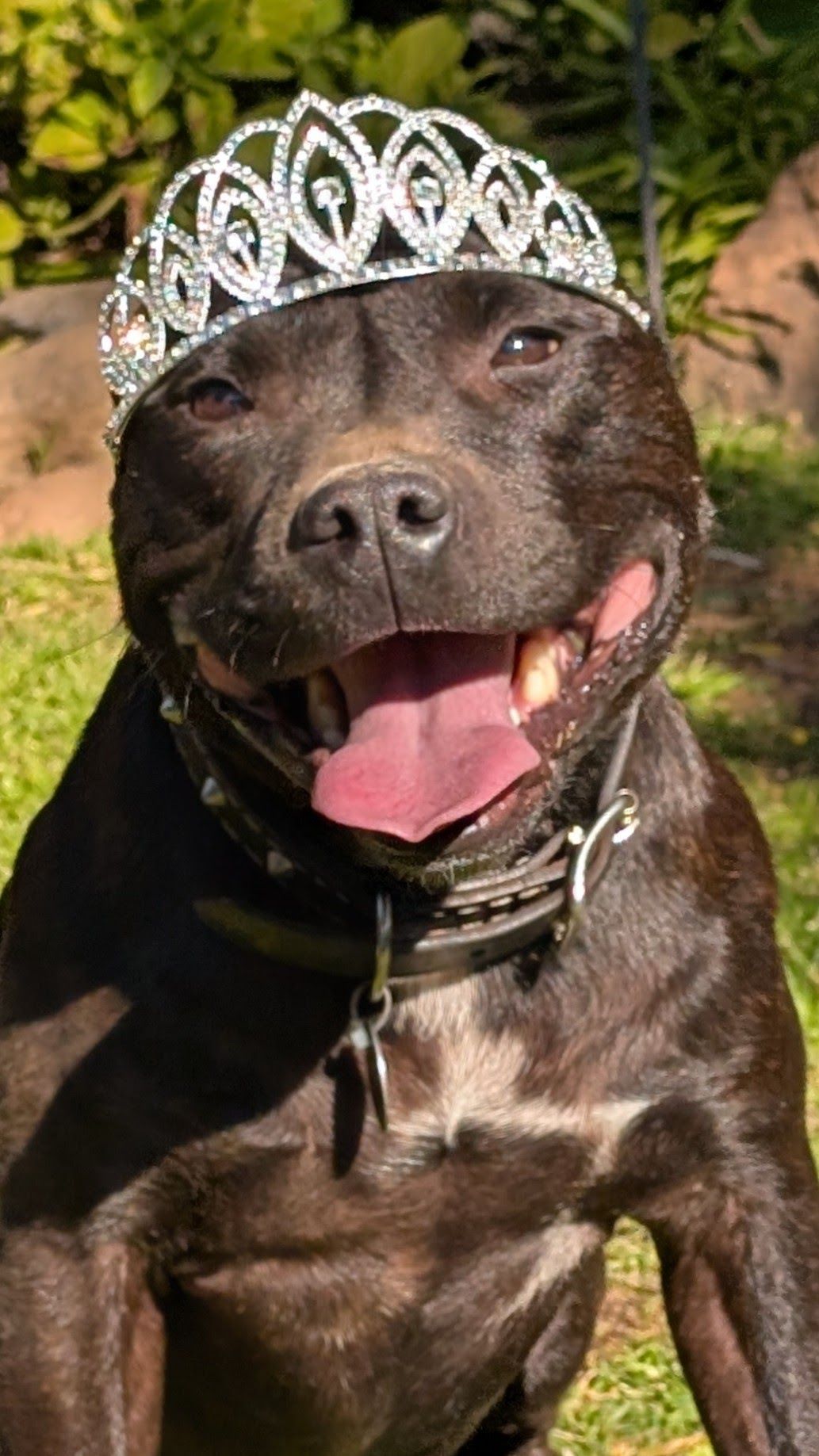 Dexter, king of training. We were so proud of Dexter for being #1 in the dog training class that we bought him (the closest thing we could find to) a crown. I have to smile at a strong, muscular, male  Staffordshire Bull Terrier wearing a tiara! For those interested in prices in S. Africa, the tiara is made of metal not plastic, and it cost us around $1.50!