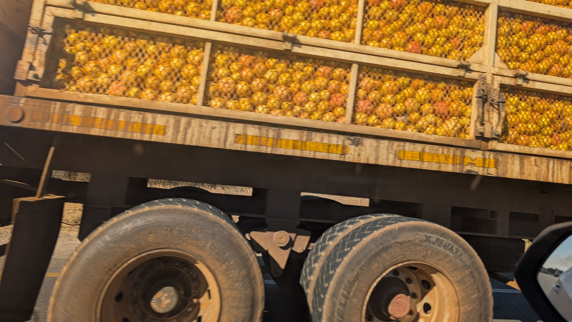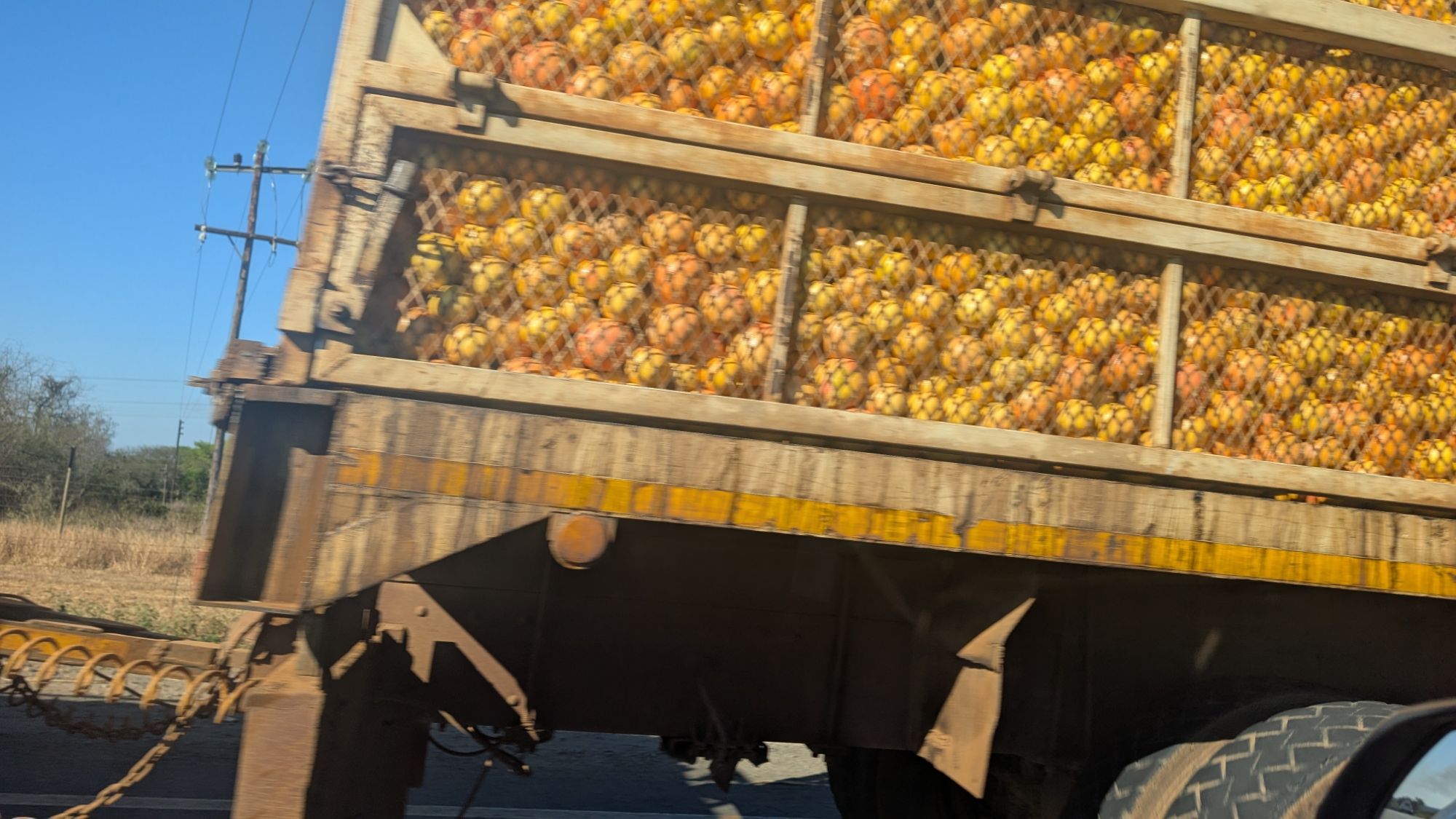 This truck was carrying three long trailers packed to the brim with oranges.