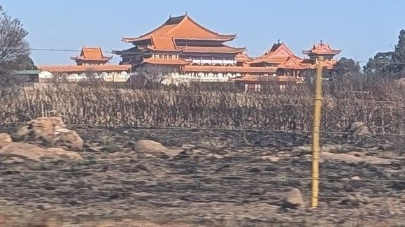 A very large shrine just off the road. I think it may be some sort of cultural something but we don’t know. In S Africa they guard against huge wildfires by doing controlled burns at this time of year; it gives this pagoda building an ethereal look.